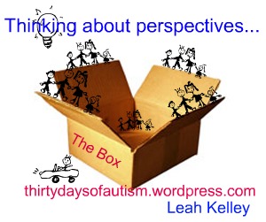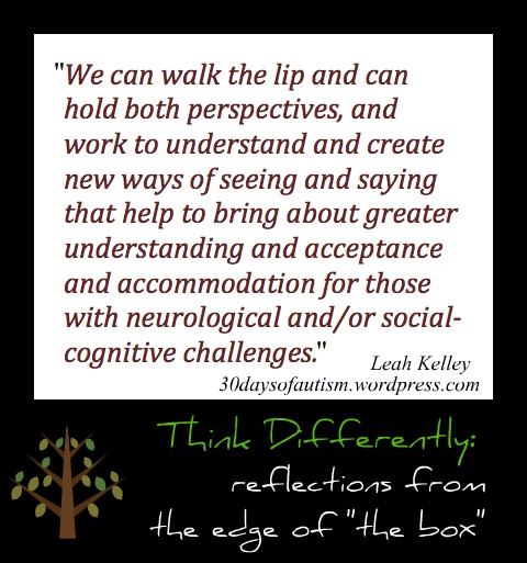 Perhaps, this is what those who work closely with children on the autism spectrum (parents, teachers, caregivers) have to offer: we can see both inside and outside the box. We can walk the lip and can hold both perspectives, and work to understand and create new ways of seeing and saying that help to bring about greater understanding and acceptance and accommodation for those with neurological and/or social-cognitive challenges.